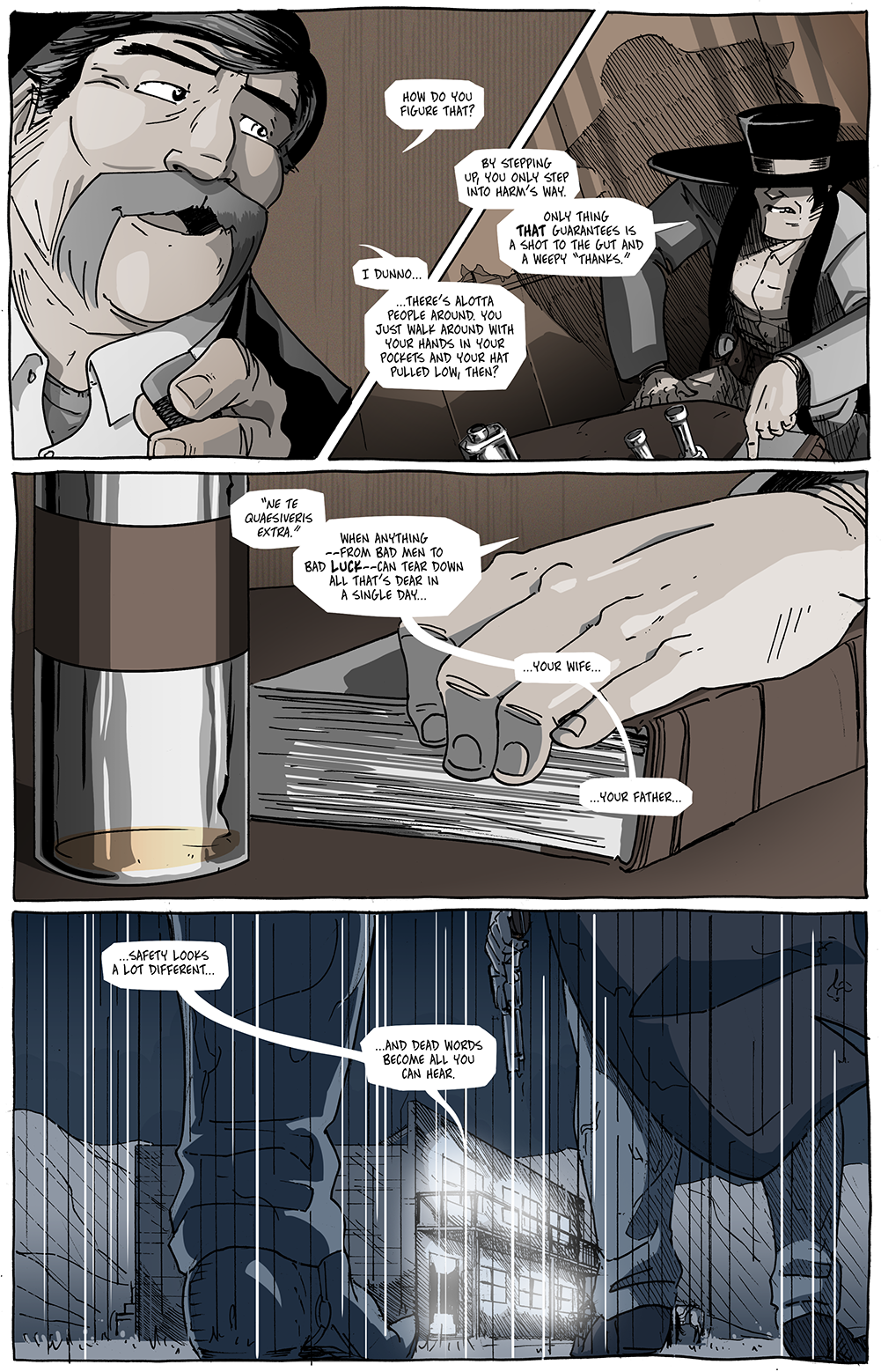 Part of this is knowing how many pages I have allotted for a scene and how much space in a scene I can dedicate to thoughtful discourse versus actually moving plot forward. The real question you’re asking when getting all that information out is “how important is what you know actually important to the reader?” Well, with two ominous figures standing in the rain at the end of this page, I’m going to say the answer must be, “not much.” Maybe next time.