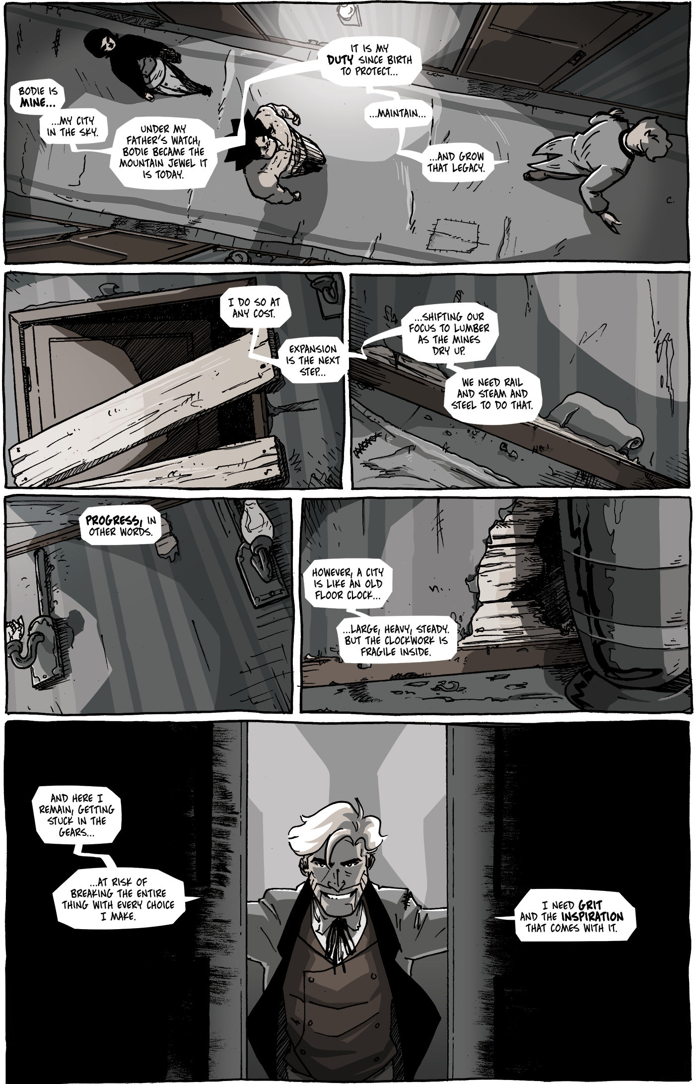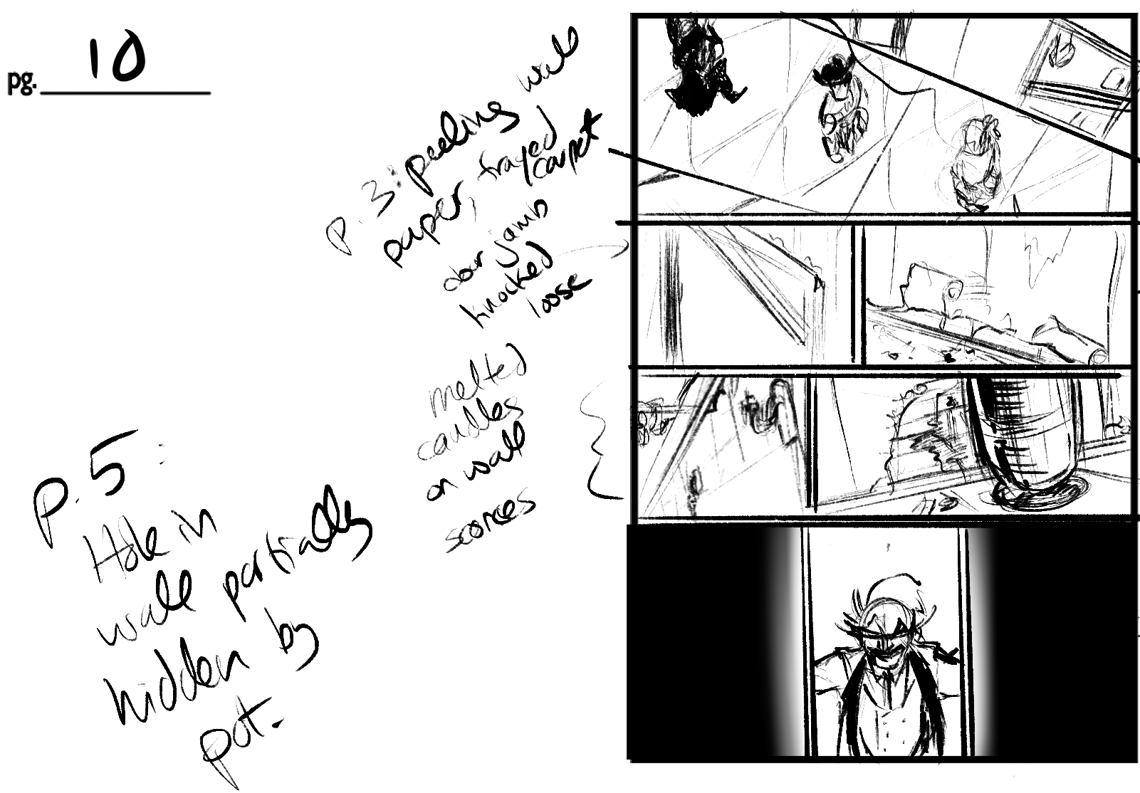 It’s Rich Jack’s monologue that inspired me to dive into this. He’s painting such a rich and regal vision of what Bodie is (or what he thinks it is) as he walks Long John and The Rook down the hall, but what we’re actually seeing in this supposed mansion of the richest person in the Basin tells a very different story. So, the imagery isn’t different for the sake of being different, it’s there to enhance the dialogue for the reader, saying more than a snarky back-and-forth conversation would ever say.