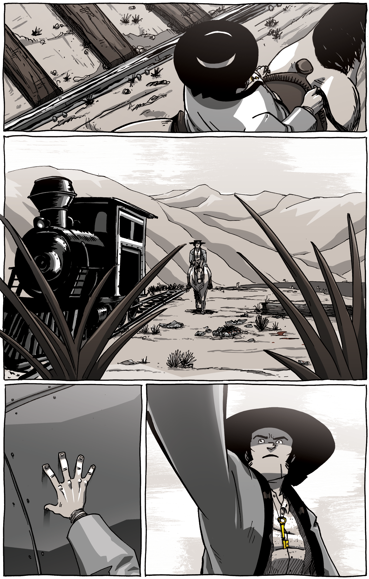 That being said, there were a few panels and shot compositions that were important and he picked up on that, and two of those panels are in this page. In “Save the Bones”, the Hellrider has a moment with this train engine––a quiet moment between a knight and the dragon she has sworn to slay––where, despite her skewed version of the world around her, here is a thing that is real and literally represents everything she’s fighting against. Without going into themes and future story, this moment was a powerful one for me and I knew Long John would come across the scene we first saw way back in Volume 1.