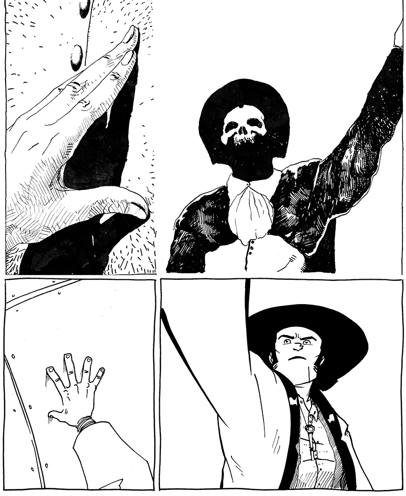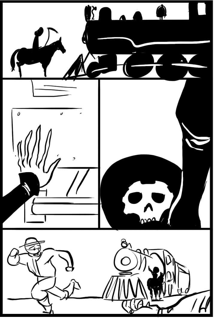 I run the risk of over-explaining the comic for the sake of talking about process. Since the end goal for these stories is print, I view these website notes more as a “director’s commentary” than a necessity. I preface with that because this page is a very explicit call-back to page 6 of the first Hellrider Jackie short story, “Save the Bones,” which is also included in the Volume 1 book. This chapter is a nexus point for the Hellrider story we’ve seen in “Save the Bones” and “The Patient Feast” (the latter is found exclusively in the Volume 4 book) as we can start to see how her story and Long John’s relate to each other.