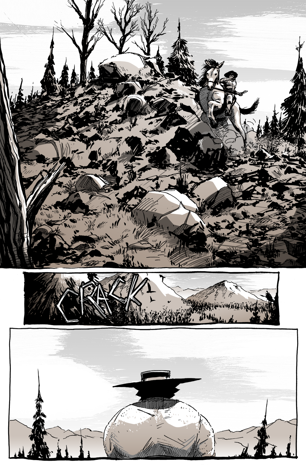 Focusing on the second “prong,” I could have easily drawn six pages of Long John riding down the mountain. Who knows, maybe I’ll add more pages of that for future collections as I think the quiet time, the chance to reflect in the open air, to look at your own problems through the larger scope of the outside (realizing how small we all are)––all of that is some thing I wanted to convey, but I also needed to tell a story. As for the second part of this second prong, my inherent trend is to cover these pages with narration. But Long John hasn’t had any narration so far in the book, so why suddenly introduce it in the third chapter. Also, if part of the point is to let Long John breathe a bit, a perfect way to emphasize that is to let the reader breathe as well and just look at the pages.