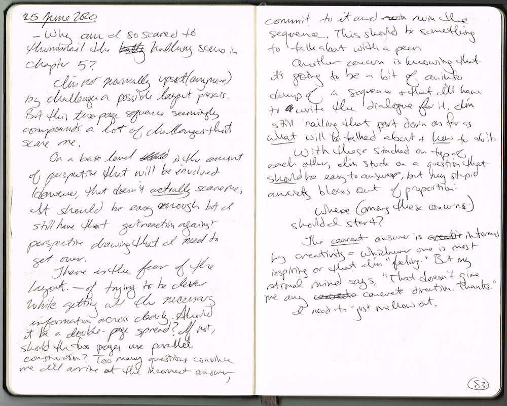 There is the fear of the layout––of trying to be clever while getting all the necessary information across clearly. Should it be a double-page spread? If not, should the two pages use parallel construction? Too many questions convince me I’ll arrive at the incorrect answer, commit to it, and ruin the sequence. This is something to talk about with a peer. [NOTE: I never did, but I really should have.]