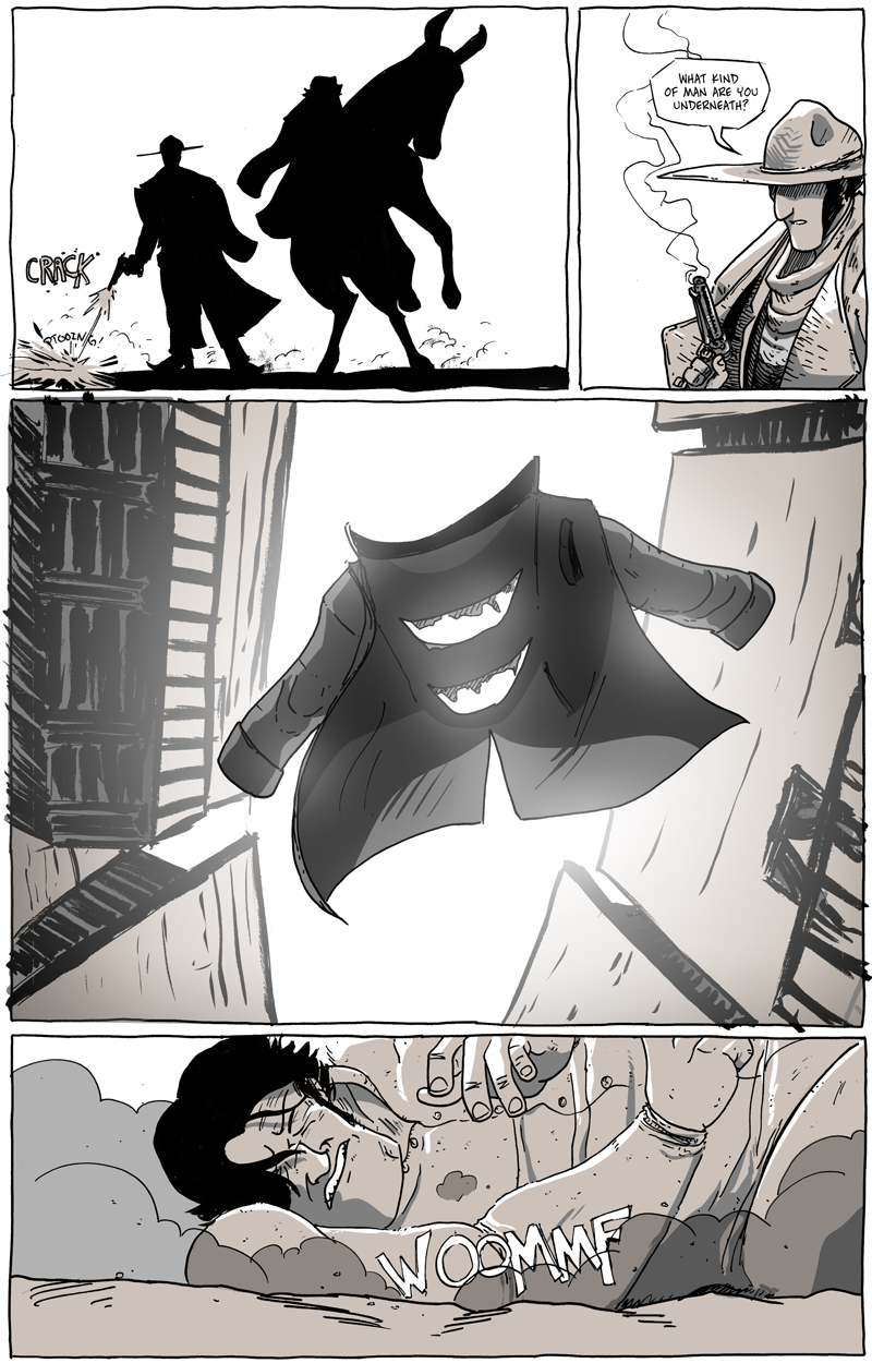 Even though it directly contradicts the “unified look” idea, I occasionally use a brush for Long John (I spoke about it briefly here). I don’t have much training with brushes (or painting, that is…I guess that’s what brushes are usually tools for), so I know I’m not going to get the gorgeous lines of many, more experienced, brush-users. The entire artistic process for Long John relies on the notion that when I sit down to draw it, I want to draw fast. So, when I use a brush, I try to not worry about perfect lines or shapes. I, instead, rely on the TenNapel method––use the brush to make each daub of ink contribute something to the page, the scene, and the story.