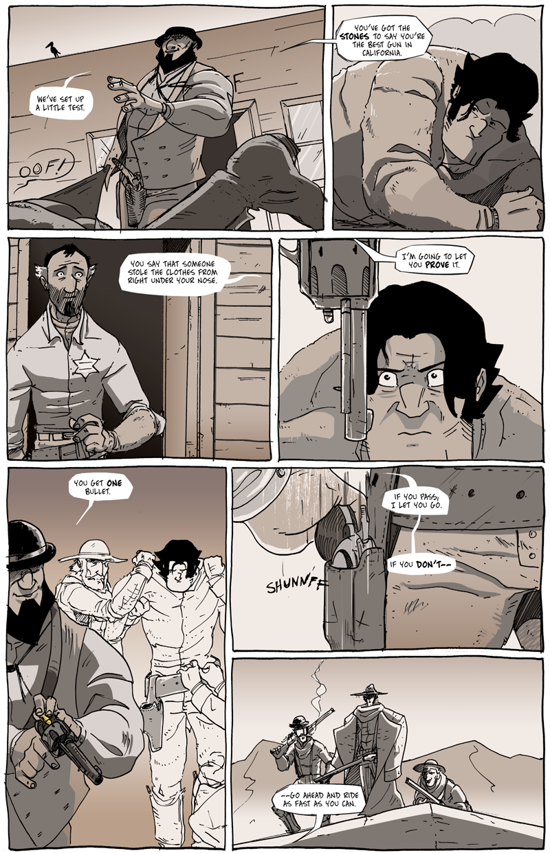 It wasn’t until I was drawing this chapter that I realized how violent I had actually made it, but I’m okay with that. Especially in “Sunza,” I really wanted to see how far I could go in the “put your character through hell”-type of storytelling. I think it’s safe to say that Long John has not been enjoying his stay in Poverty Flat. However, the violence extends beyond the beat-down, beyond the constant pushing and falling. The attitudes are violent, the tone is violent, the words are violent as are the postures and the stares and the buildings. In that sense (to me, at least), I am surprised at how violent I was able to make it with only firing one shot (soon to be two, at least).