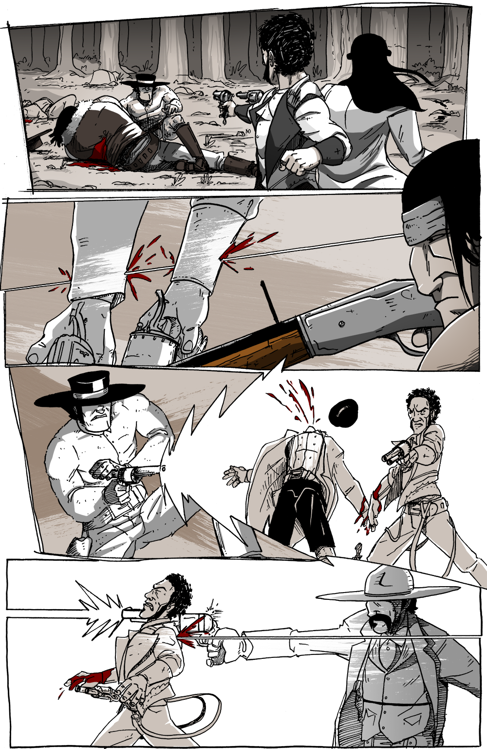 The last fight scene occurred back in Chapter 1, when Long John got the tar kicked out of him after showing up in Poverty Flat wearing another man’s coat. The scene took only a single page, though the choices in that page established the lexicon of violence for this series that I came back to a few times.