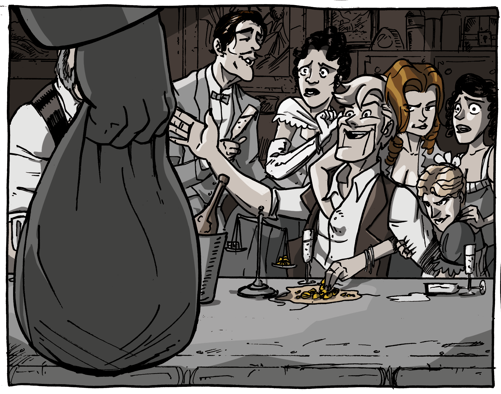 Behind the scenes: the blonde and redhead are absolutely taking advantage of the moment to distract Rich Jack and take as much of that gold as possible without him noticing. Click for larger version.