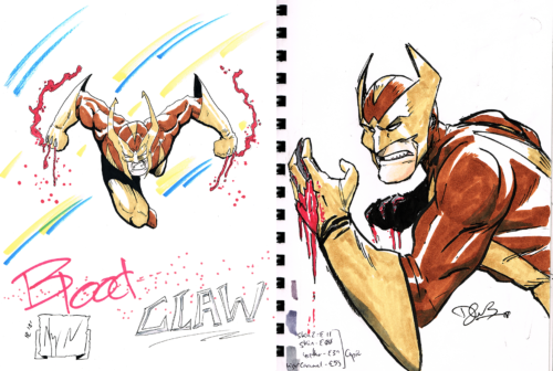 One thing we brought up was the sheer amount of Wolverine clones that cropped up during the ’90s boom, and we accidentally created our own: Blood Claw. As it turns out, there are already plenty of characters named Blood Claw, but the premise was solid. During the second day, Kyrun did an initial design and I followed with my own interpretation.