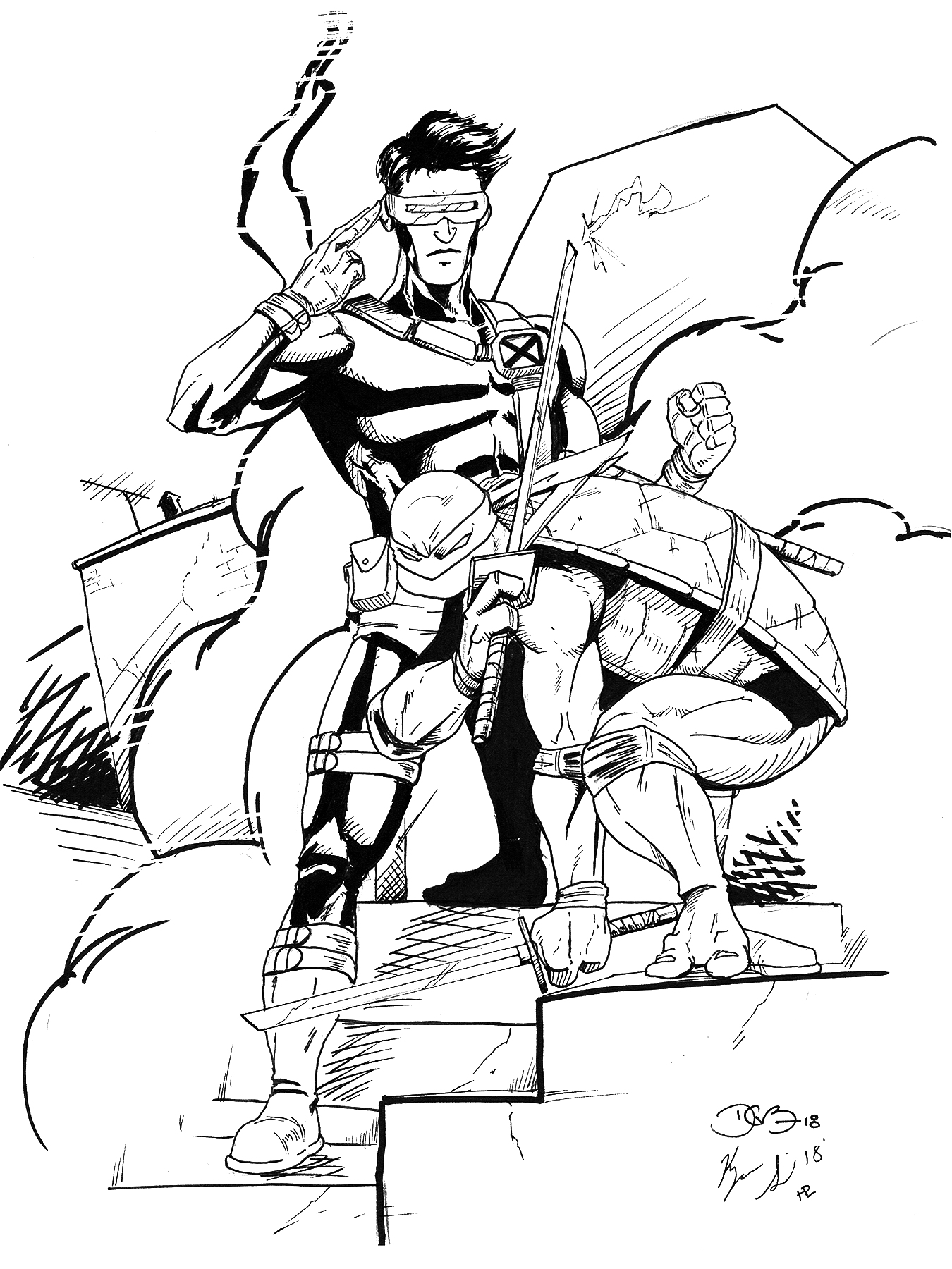 The unbridled creativity fostered not only by the conversations Kyrun and I were having but also by being in the Artist’s Alley section overwhelmed me on the first day of the show but, by day two, got me to put pen to paper and not care about anything deeper other than having fun drawing and sharing. Tabling with another comic artist, I decided I would demand that he ink a drawing I made, so I did an interpretation based on a drawing from my BackMatter sketchbook that I still dream about: a team-up between the leaders of the X-Men and the Teenage Mutant Ninja Turtles: Cyclops and Leonardo, respectively. The final product turned out wonderfully.