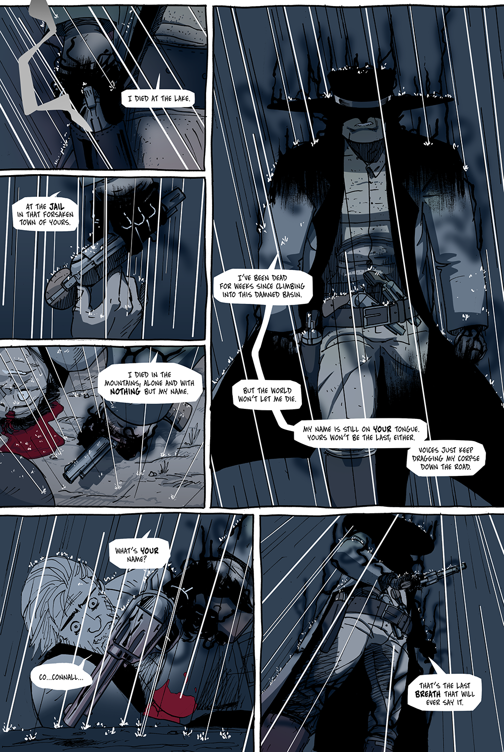 The first part that complicated things was in the inking stage when I inked in rainfall. For most panels it was easy––pick an angle and draw a bunch of lines at that angle. In terms of composition, the hard part about that was deciding how many lines to draw over the figures themselves, begging questions like “am I obscuring too much?” or “is this enough or does it just look like speed lines?” For panels like the last one on this page, I had to figure out a vanishing point to sell the low angle of the figure.