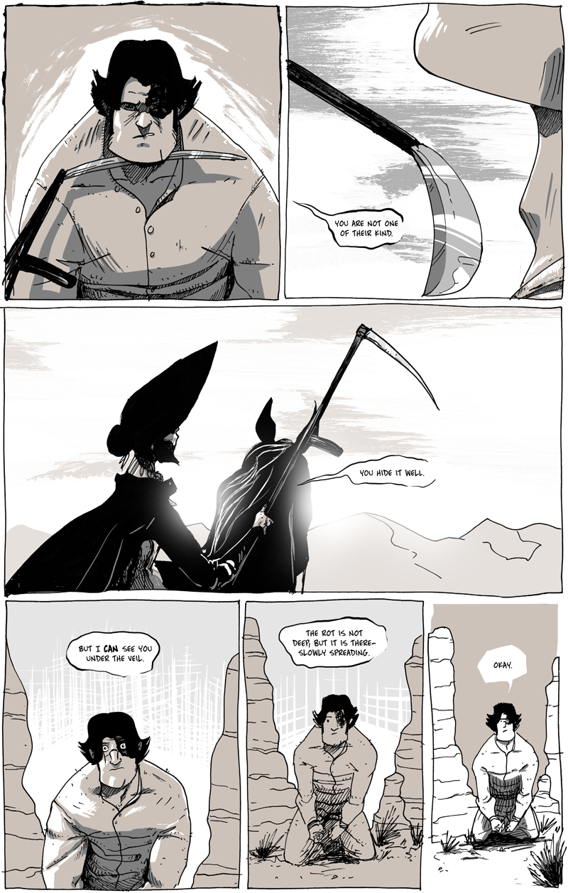 By successively draining the color out of him in the last three panels, I was hoping to really show that––even though we don’t really know what his story is, yet––we know where he is: empty and without reserves.