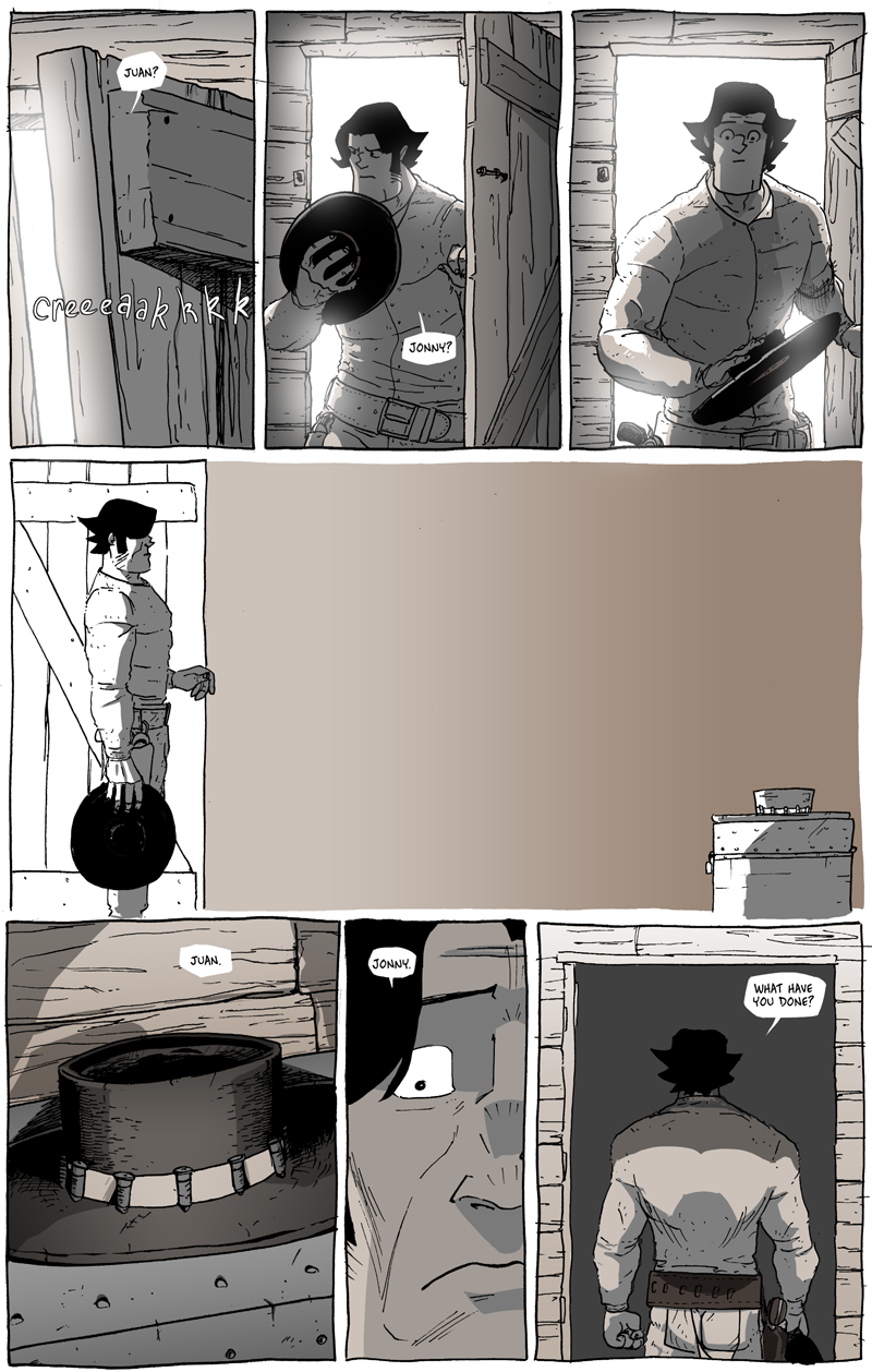 First and foremost, one of the things that informs me most for the important moments in the comic––and I’ve written about it a little before, with regard to kabuki plays (the concept; I haven’t actually seen any kabuki plays, but I greatly appreciate their theoretical underpinnings)––is that I really like the aesthetic of looking at things as if one were in an audience at a play. Hence, the fourth panel when scenery and detail get stripped away for the symbolic importance of the moment; in this case, when Long John sees a remnant of his previous life in front of him for the first time in the story.