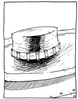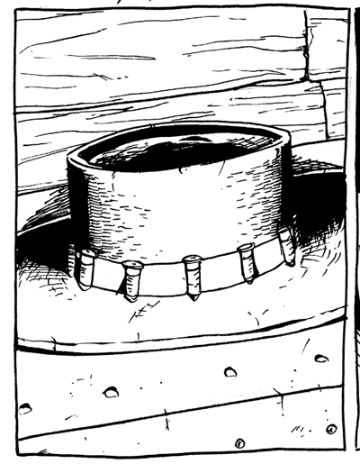 Another interesting aspect of this page is the fifth panel. Only once before have I had to re-draw a panel. I got as far as the “coloring” stage for this page when I realized that I wasn’t happy with the close-up of the hat, which originally was much messier and, if I may be frank, lazy:
