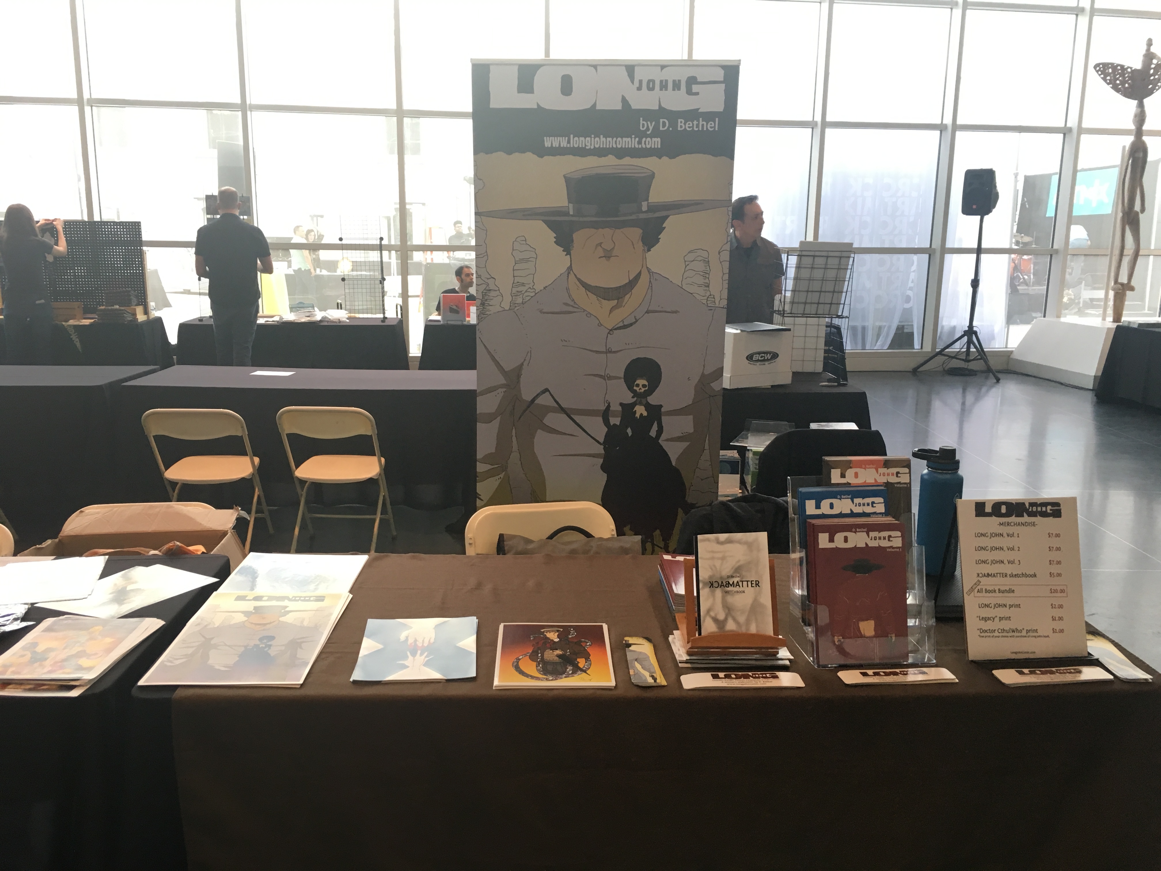 It was interesting to go back to a full-table setup. It had been awhile since I put prints out for sale as well as original artwork for people to peruse and compare to the printed versions, the latter of which people took a high interest in, more than ever before, which was nice to see. Some even asked about making a few of the splash pages into prints, which I hadn’t considered before because I so closely tie the page to its narrative that looking at it on its own never crossed my mind. However, it is something to consider.