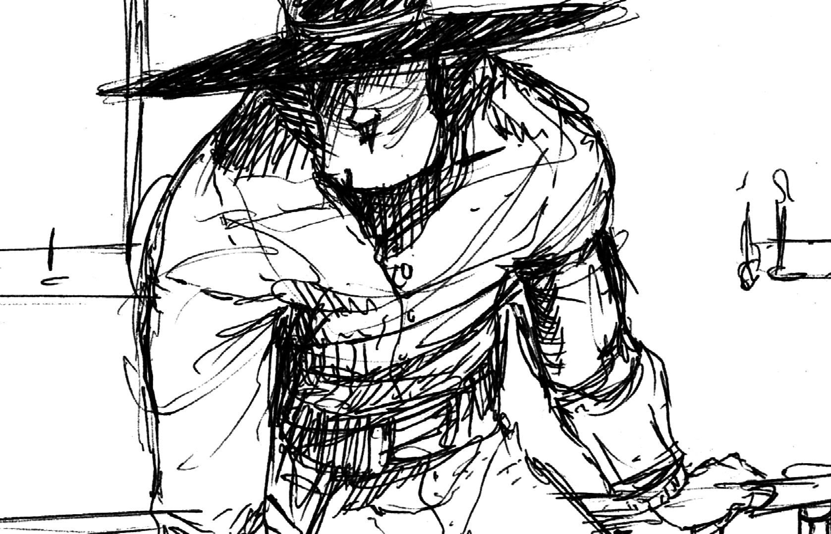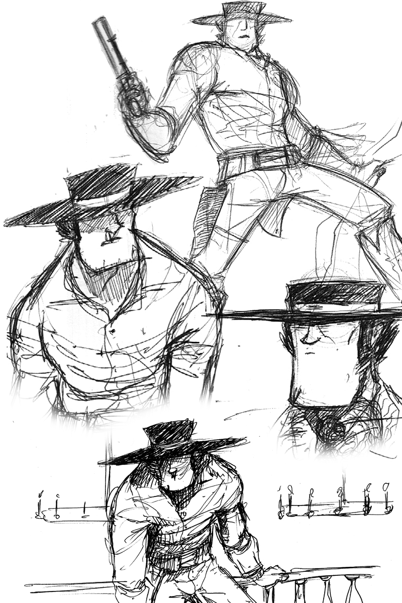 Visually, he has always kind of been what you would get if you stirred together the DNA of Clint Eastwood and Arnold Schwarzenegger––a monolith of a man with a stare squinted from the sun. The only real changes have been his accessories. For awhile he wore leather chaps, but I dropped them because they seemed to be a pain to draw and they covered him up too much. He lost a gun at some point, too, especially when I decided his nickname existed before his predicament. All of the other elements are pretty much the same: his long, squared jaw; his flat, wide-brimmed hat; the always-in-shadow-eyes; the busted button on the butt-flap.