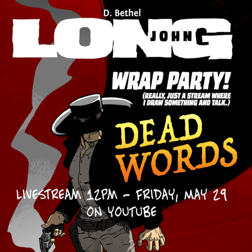Tomorrow brings the last page of Chapter 4 – “Dead Words”! To celebrate, I’ll be hosting a livestream at noon on YouTube where I’ll do some live drawing and be open to talk about Chapter 4 (the comic and the videos) as well as anything else you might want to talk about––comics, art, music, movies, (nearly) anything!