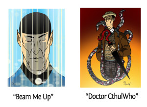 - 8.5″x11″ prints of fan-favorite illustrations by Dan: “Beam Me Up (Leonard Nimoy Tribute)” and”Doctor CthulWho.” (Prices Pending)
