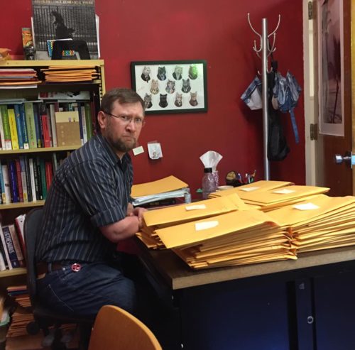 FCBD helped to delay the inevitable. Me at my desk with 97 writing porftolios. Photo by Shelley Blanton-Stroud
