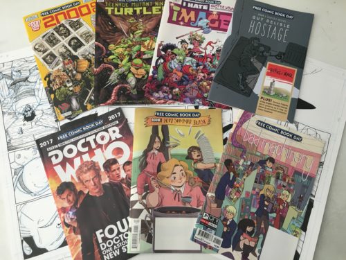 My haul of the Free Comic Book Day books. Clockwise from the top left: 2000 AD, Teenage Mutant Ninja Turtles, I Hate Image, Guy Delisle’s Hostage, Bad Machinery, Boom! Studios 2017 Summer Blast, and Doctor Who.