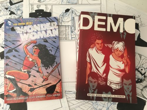 Books bought on discount at Free Comic Book Day (left to right): DC’s Wonder Woman, volume 1 (New 52) and Dark Horse Comics’ Demo.