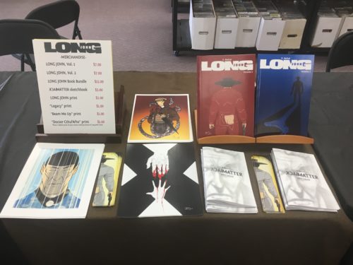 This event marked the debut of the Logan-inspired print, “Legacy,” as well as my sketch collection, BackMatter (which is now on sale in the store!) and though “Legacy” may not have been the most appropriate piece for this all-ages show, most people got a chuckle out of the Long John, volume 1 cover with kids pointing in shock, joy, or horror as they waited in line to grab their free comics.