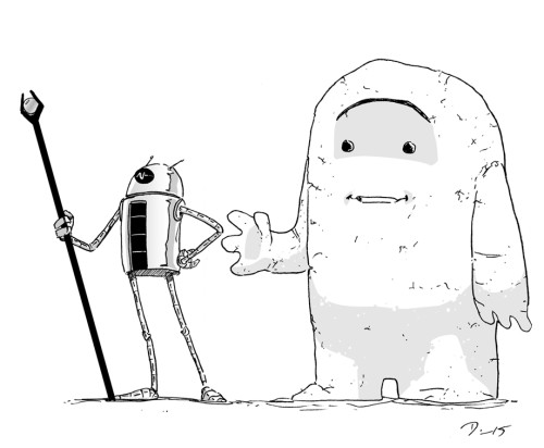Rock & Tin follows the adventure of Trax the robot (who also goes by Mechmagus, who used to go by The Overseer––I’m choosing to use Trax because I like like it the best) and Peto the Stone Golem (who is given his name by Trax) as they try to save a near-extinct race of robots from obliteration at the hands of the evil Archtinkerer (previously just Tinker), Trax’s brother. The interesting philosophical investigation occurs in the first twenty pages or so as Trax awakens the lost, slumbering golem and they work to establish its identity where it previously had none.