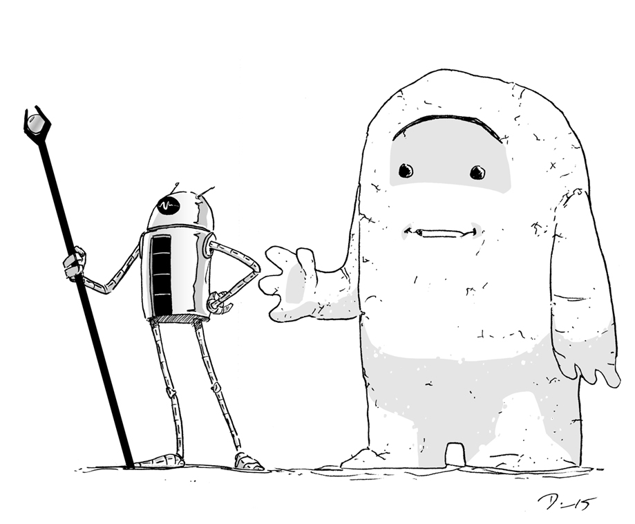 Such is the conceit of Tom Dell’Aringa’s latest webcomic-turned-graphic novel, Rock & Tin, an all-ages sci-fi fable that manages to have fun while asking some really interesting and tough questions about identity. If this seems a bit at odds with an all-ages comic, I wouldn’t disagree, but the fact that this is a story meant to run the gamut of the literate readership, I applaud him for breaking the false equation most people make by thinking “all-ages” means “only for children.” What comes to mind for producers of actual all-ages stories is, of course, Pixar, whose movies definitely find the balance of appealing to audiences both young and adult. There is no doubt that the Pixar ideal is the mark for which Dell’Aringa is aiming and does an admirable job of hitting. There is a tension in the book, however, that pushes apart theme and story, caused by the very foundations of what makes science fiction great, though it doesn’t necessarily damage Rock & Tin overall as it is a fun reading experience with great art and solid sequential storytelling (i.e., Dell’Aringa knows what he’s doing and it shows).
