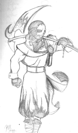 The first major implementation of Hellrider Jack was when Josh and I, in high school, decided we were going to make a Japanese-styled role-playing video game not dissimilar from major titles at the time like Final Fantasy, Chrono Trigger, the Seiken Densetsu series (most notably, The Secret of Mana for the SNES here in the US), or Dragon Warrior. I got caught up in creating the characters and world-building and was able to work in a character named Hellrider Jack who was a former valiant knight who––for reasons forgotten––became disgraced and was forced to wear a cursed mask constructed a human skull. He rode around on a robotic horse and became a legendary figure.