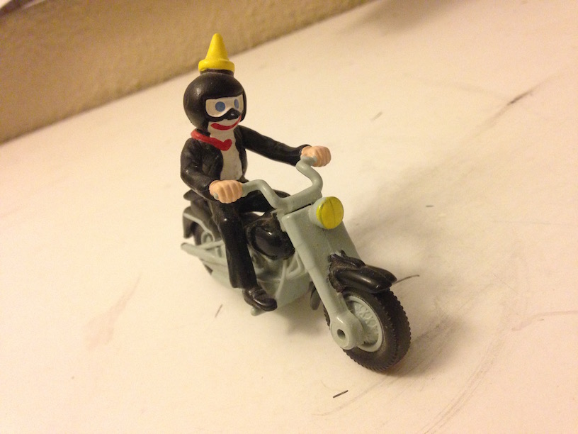 This is a children’s meal toy the fast food chain, Jack in the Box, released in 1997 a collection that has the chain’s eponymous “Jack” doing a variety of interesting things that may seem out of character for a guy with a large, spherical head. Somehow, Josh and I got a hold of the figure above. For some reason, we got a huge kick out of this little figurine one afternoon. Being the creative people that we are––and, being the very bored kids at the end of our high school careers that we were––we each took turns making up stories about this motorcycle-driving Jack. One day, we were sitting around playing video games and one of us was playing around with this toy, narrating his thrilling adventure out from the depths of a literal hell, and––bursting forth from the grasp of Satan’s flames––one of us said something to the effect of, “…and here comes––Hellrider Jack!”