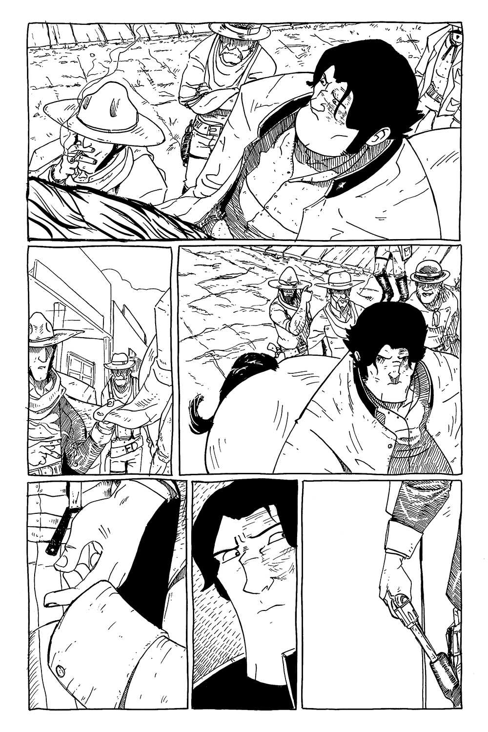 I’m still incredibly proud of the entirety of Chapter 1. But this page here (page 16) is probably my favorite of the bunch. For one, I felt all of the influences––spaghetti western, noir, Kurosawa––really come through but congeal into something unique. It’s also a page whose linework I love. Until this page, I never saw one of my panels and thought “I’m looking into the world of the comic,” but something about the angles and detail and character coming through every panel really made it feel alive to me in a way I had never felt about my work. Despite some perspective issues an unsure lines, it’s a page I think about often.