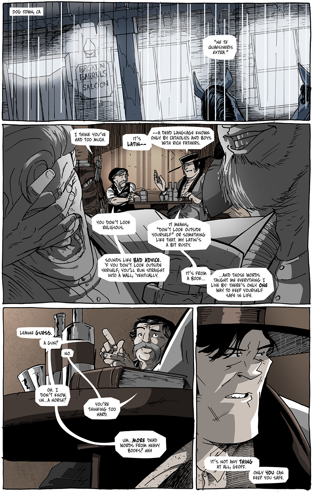 This is a fairly simple page, but I really like how it captures the mundane: a busy bar on a rainy night. There’s a lot of importance to this page; it’s the title drop, of course, but it’s also the start of some of the deepest (implied) backstory we get to our title character so far in the series (the writing––and holding back––of which, I write about more on the notes for this page).