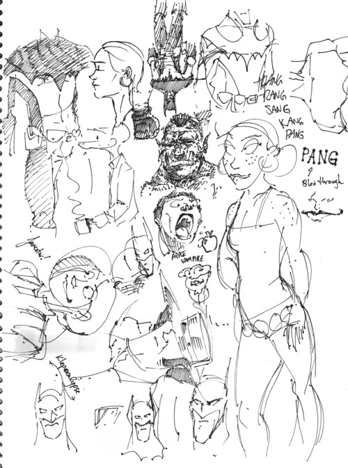 This particular pile was all drawn with a fine-tipped Sharpie, so I had to move fast and really make each line count or else it would be plagued by bleed-through and a complete obscuring of whatever it was I was trying to draw. With that in mind, most of the stuff on this page is just random (I even start playing with the bleed-through a bit). At some point, I got interested in redesigning Batman’s costume which lead nowhere. There are also some characters on there: Long John, obviously; Janester, a character from Eben07; there’s a wolf holding a mug of coffee which is one of my dad’s cartoons he leaves on napkins and receipts at restaurants with groan-worthy one-liners.