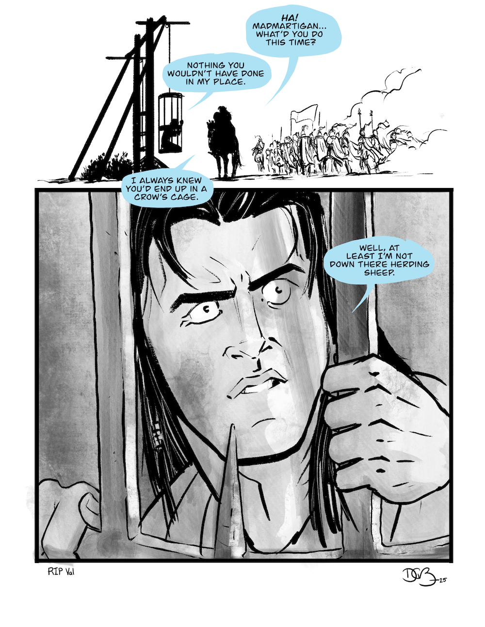 I did try to do the more saccharin likeness, but it wasn’t coming together––and I’m glad it didn’t. Instead, I kept coming back to the scene where we meet Madmartigan, left in a hanging iron cell to rot. After meeting Willow and his friend, Meegosh, they’re interrupted by an army that marches past them––off to war, presumably. They’re led by a flamboyantly gilded general named Airk who recognizes the man in the cage. Despite wanting out––and an offer to be let out to help fight the war––Madmartigan rebuffs Airk saying he’d rather rot in a cage than to be “herding sheep.”