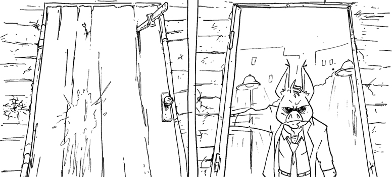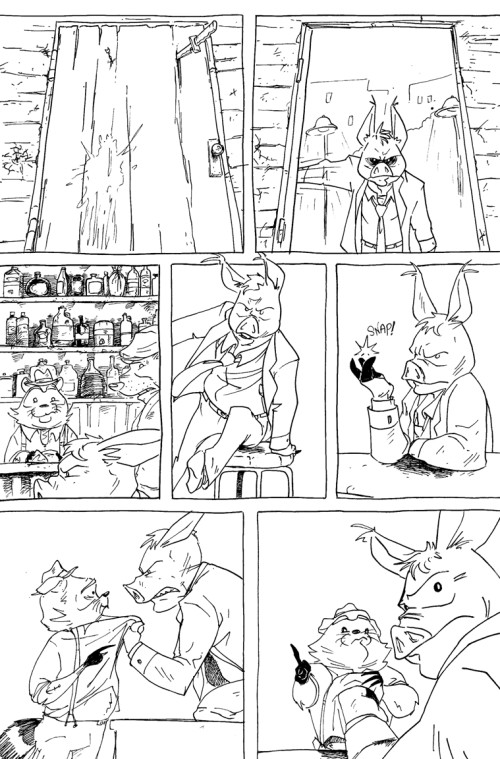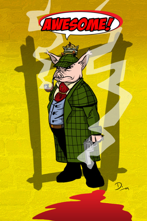 The flagship book of BrainFood was Lauren’s book, The Slightly Askew Adventures of Inspector Ham & Eggs, a violently funny comic following Inspector Serrano Ham and his virulent and misanthropic sidekick, Eggs. At the time, Lauren was looking to expand the franchise. The main book had run its first story arc to conclusion and she had some spinoff ideas. One of them was a title called On the Trail with a Curly Tail (I think), an anthology-style collection of early stories from Serrano Ham’s career. I was tapped to draw one of them, but it never fully materialized for one reason or another.
