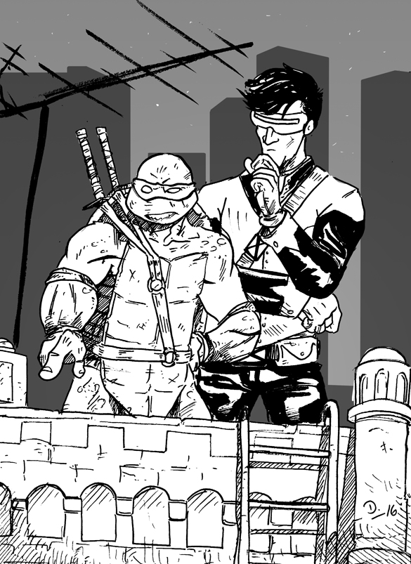 So, I wondered what would happen if I facilitated a crossover––what if the boring, boy scout hero from one franchise met up with the equivalent from another? I bandied about with possible action drawings of Cyclops letting loose his optic blasts as Leonardo leaps into the fray with both swords drawn. But that felt easy and nondescript. What would really happen if these two stoics met up? What would actually occur? I figured they would plan. They would be planning the night before. So, I gave them a rooftop and let them talk, and I’m sure I may be one of the few that is quite interested in what they’re saying to each other.