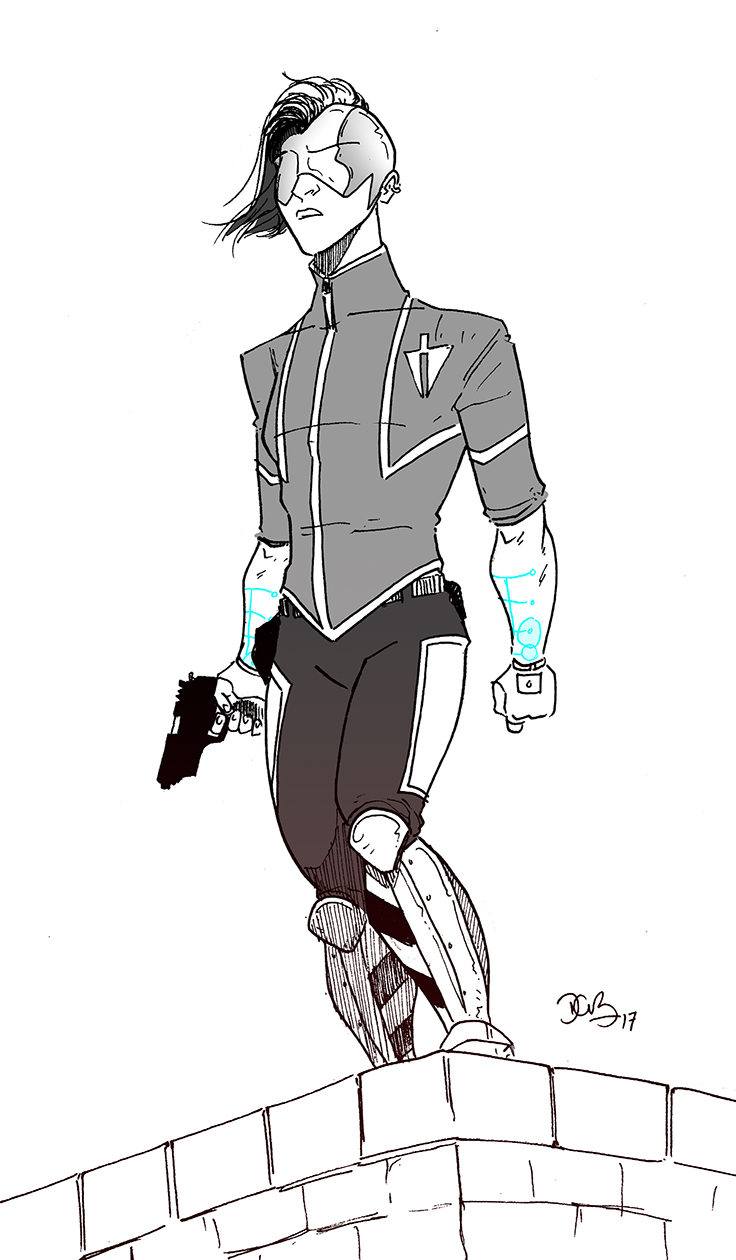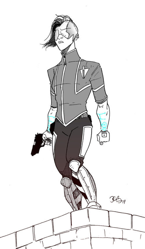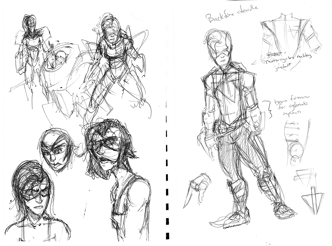 This concept intrigued me, especially as it applied to a team of superheroes whose bodies were intrinsically and biologically intertwined with cybernetics. For someone like Backfire whose face––one of the first determiners of our humanity to others––is half gone and who cannot see traditionally, this schism seemed to be most pertinent. So, in developing the character anew, I figured that because Backfire’s traditional means of interaction and main signifier as an individual in the world and culture around her was taken away (i.e., her face/eyes), she would voluntarily enhance and modify her body with man-made cybernetics in order to feel more connected with everything else. Specifically, the installation of cybernetic interfaces in her forearms allow for even more fine-tuned hacking and manipulation in concert with her telekinetic control of technology. Also, these physical interfaces could be used, if she allowed, by members of her team. It emphasizes touch and interaction with the important people in her life. Ultimately, by making herself more different, she tries to reconnect and, for her job as a superhero, to maximize efficacy. It’s a character quirk and, of course, it would be a need to overcome, but it’s an interesting start to me.