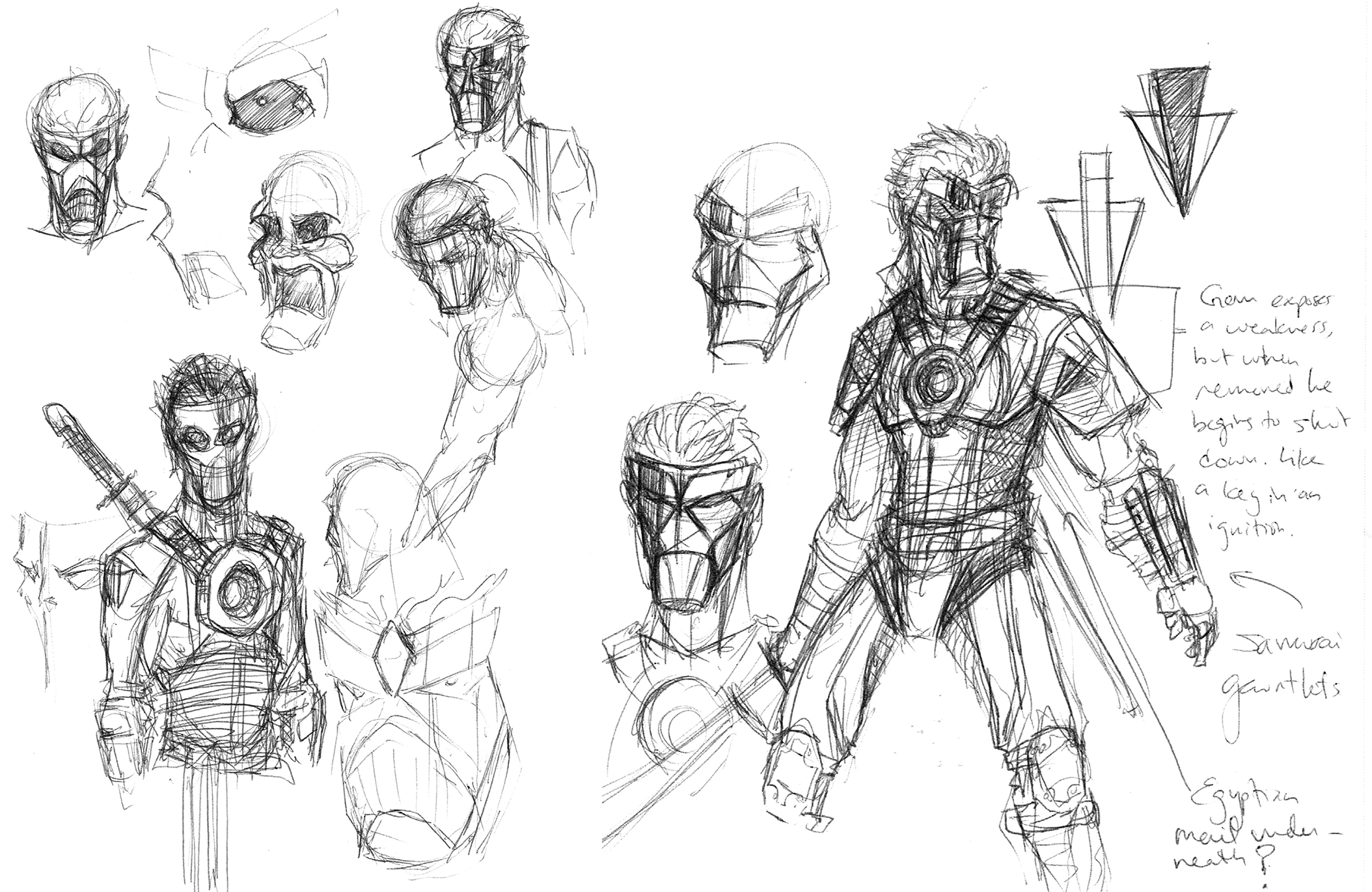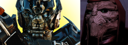 My later character, Venture, was basically a fantasy version of the sci-fi Katana––immortals moving forward through history in real time, permanently bonded face masks, big swords––and Josh and I worked hard to intertwine their stories as often as possible. So, to distinguish him from Venture––and to play with the sci-fi tropes a bit––my main focus was on his mask, and it gave me a lot of trouble. Eventually, I stuck with the permanently affixed mask but broke it up into pieces so he could still talk and emote if needed. My basic inspiration for that was a cross between (and I hate to say this first one) the designs from the Michael Bay Transformers movies and how they created emotive but mechanical faces and the faces of the Turian race of aliens from the Mass Effect video game series. For both, instead of muscles under skin, the face is broken up in to hard plates that rest on top of a muscular (or whatever) structure and shifted and moved when they talked or emoted, and I thought that, while possibly more effective in an animated form, this could be a cool effect for Katana’s mask instead of just being hockey protective gear. The final design ended up a bit Iron Man, but it still works.