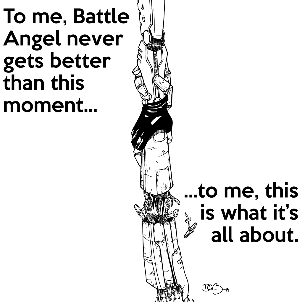 To me, Battle Angel never gets better than this moment. To me, this is what Battle Angel is about: a lone (and lonely) figure that holds onto hope and optimism in a world settled in its self-maintained nest of societal oppression and all are destined to fail. It may not be an ethos I agree with, but it does strike a chord in my core. Maybe it’s the thing I’m consistently fighting against not only with my creative endeavors but with my own self-doubt and anxiety.