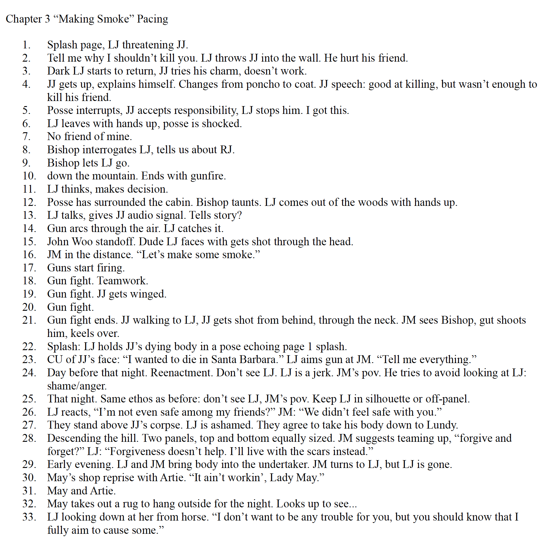 Generally the first thing I do is a chapter outline, though I call it a “Pacing” document which lays out numbers for each page of the book and I write out what generally happens on that page; it’s less a summary and more a reminder of what this page needs to do to be an interesting page and to move the story forward to the next page.