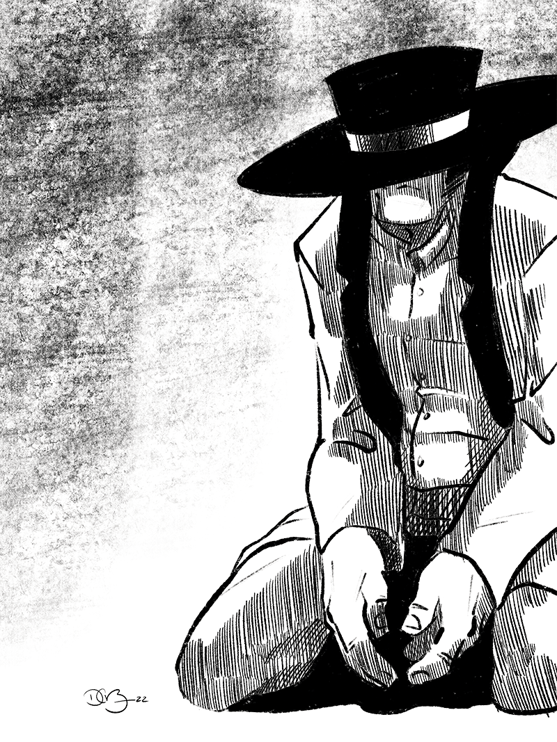 There are more obvious elements, of course, like font choice and the logo. However, there are more subtle choices––the back cover and the inside back cover are always the same; the “Looking Back” at the bottom of the inside front cover is always a terse and abstract recap of the previous volume (an idea stolen from Cormac McCarthy’s chapter descriptions in his horrifying book, Blood Meridian); of course, there’s what I call the “white page” at the end of the story content of each book (something I started doing with my previous comic series). Then there is the frontispiece.