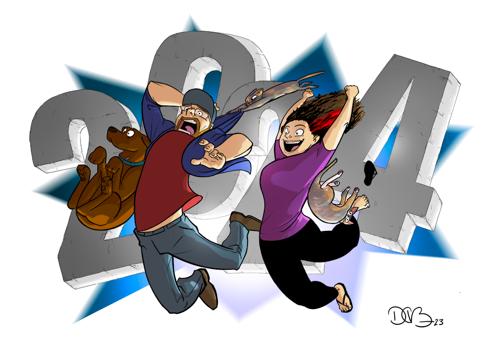 It’s been a few weeks, so we can finally unveil this year’s New Year’s card that went out to friends and family. This was fun to do (though I stupidly deleted the Procreate file that had the time-lapse saved with it) because I really enjoy drawing exaggerated, cartoony versions of me, my wife, and our animals as much as the serious, chiseled-jaw grimaces found in Long John.