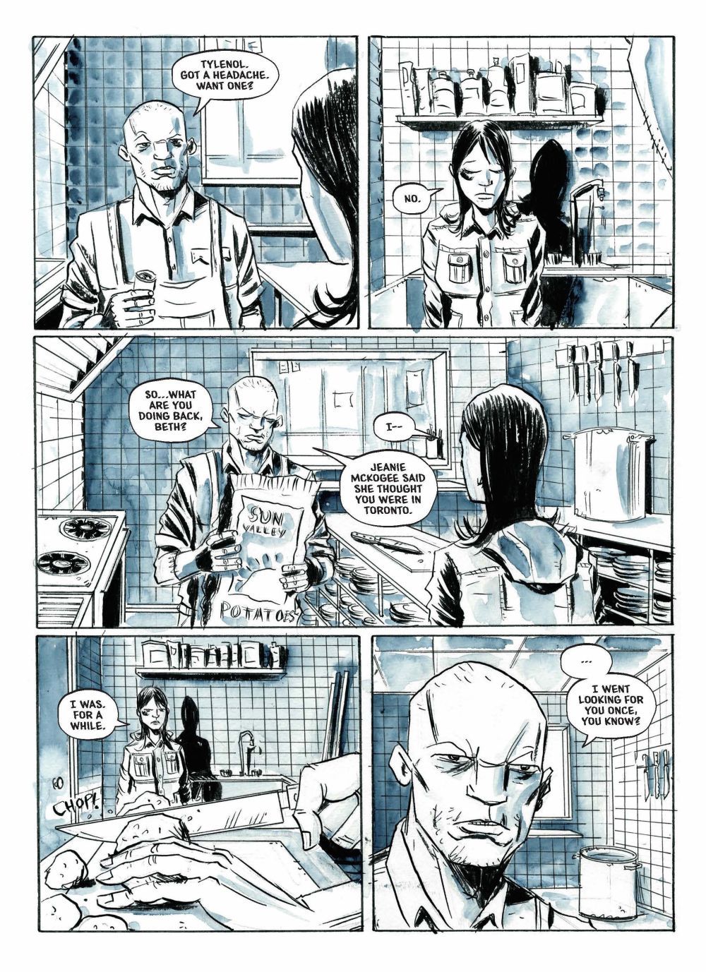 This cuts to the essential difference between graphic novels and prose novels. Reading Roughneck will take you a few hours and will feel like it, if faithfully translated, would take the length of a short film. A prose novel of a similar length could easily be a season of a tv show, in comparison. When relying on the blend of imagery and text, the amount of story you can tell gets squished down tremendously in a graphic novel. What could easily take a page––hell, a paragraph––in a prose novel could take up four or five pages in a comic. So, due to my literary background, I don’t deny that there is an inherent disappointment that comes with reading graphic novels––meaning long form comics released as a single volume (not just a collection of individual issues)––because their plot content is so much less than a traditional novel; however, what we gain from having visuals and the rhetorical tools graphic novelists have at their disposal yields a much different result than what a prose novel brings. A graphic novel begs you to really look at the images, study the faces, the changes from panel to panel––those were choices made by the author, notice them, come up with an understanding as to why those choices were made and how it aides the story being told. But, like any book, that’s only if you want to. There’s nothing wrong with just reading from cover to cover and saying, “That was fun!”