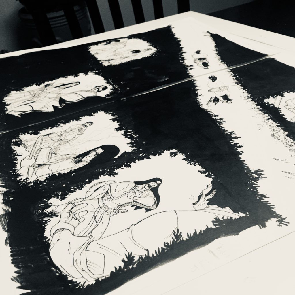 I mentioned last week how I was stuck on a two-page spread. It was a conundrum that, when presented with the final product, can be underwhelming. I run the risk of “spoiling” to much by sharing the page, so I’ll share a slightly abstracted version which I shared on my Instagram account. What help me up is that it is a scene that answers, in flashback, a lot of questions asked in volume 1 and 2 of Long John, and I wanted to make sure I chose the absolute right images to flash back to. I’m still not convinced I made all the right choices––I even for the first time––made some slight edits (not artistically, just structurally) in Photoshop to make it a more accurate read, but I think I got there.