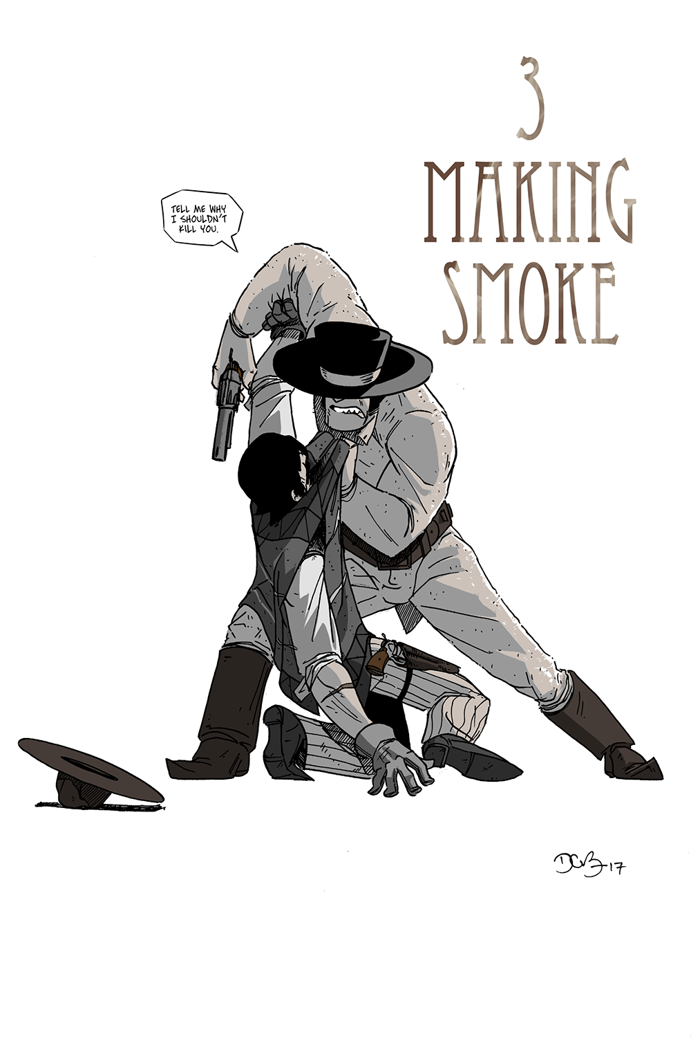 With Chapter 3 “Making Smoke” all drawn, the last month has been nothing but coloring and lettering the book, which is less frustrating than drawing and more rote busy work. It’s also at this stage where I find I really start doubting my artistic ability. Since much of this part of the process is spent zoomed close on the art, I can see where my technical acumen come up short. It’s when I’m up close where I can see my lack of patience––as well as my laziness––shine through with inking mistakes, anatomy shorthand, and flaws due to exhaustion or boredom (at the time). However, it’s likely mostly a consequence of realizing I’m closer to having a book that I will put out there in stores and on this site that people can actually see and respond to. The inherent self-doubt gets loudest at this point, which is a voice that I always have to deal with, whether here or at my day job, or running errands, or going to a party, or whatever. What helps is the memory of having done good work before and knowing I can do it again. A piece of advice I throw out to my classes now and then is something I honestly live by: