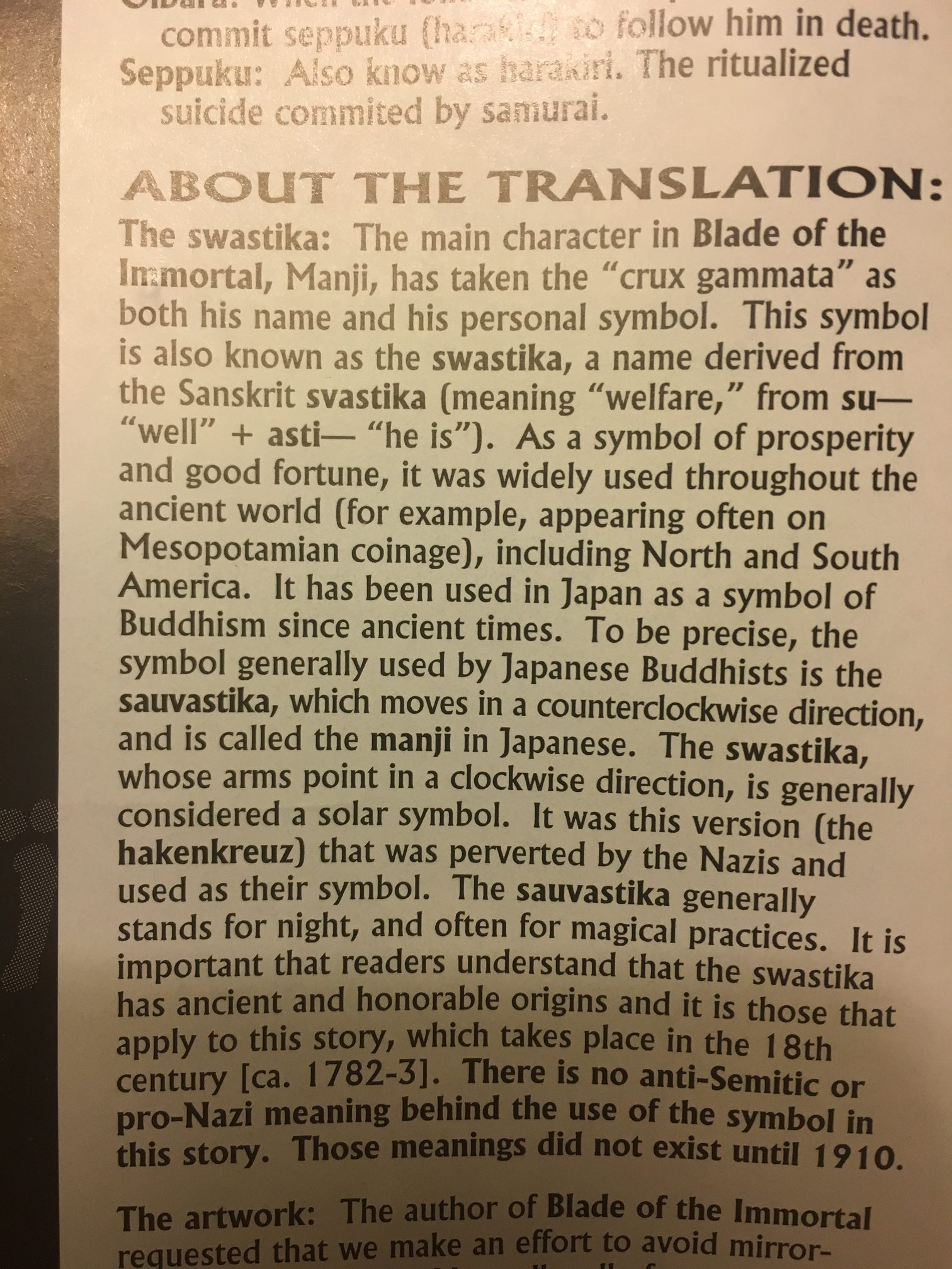 In the comic, on the back of Manji’s robe is a huge swastika. Being a comic set in pre-World War II Japan, however, it’s clear it’s not a symbol of Nazi Germany or (obviously) white nationalism. In every issue Dark Horse Comics published, there was a frontispiece that explained the swastika symbology and how it related to Buddhism and its history in Japan. Ultimately, it’s a symbol called “manji” which is the protagonist’s name. It’s the equivalent of Superman’s “S” shield on his chest.